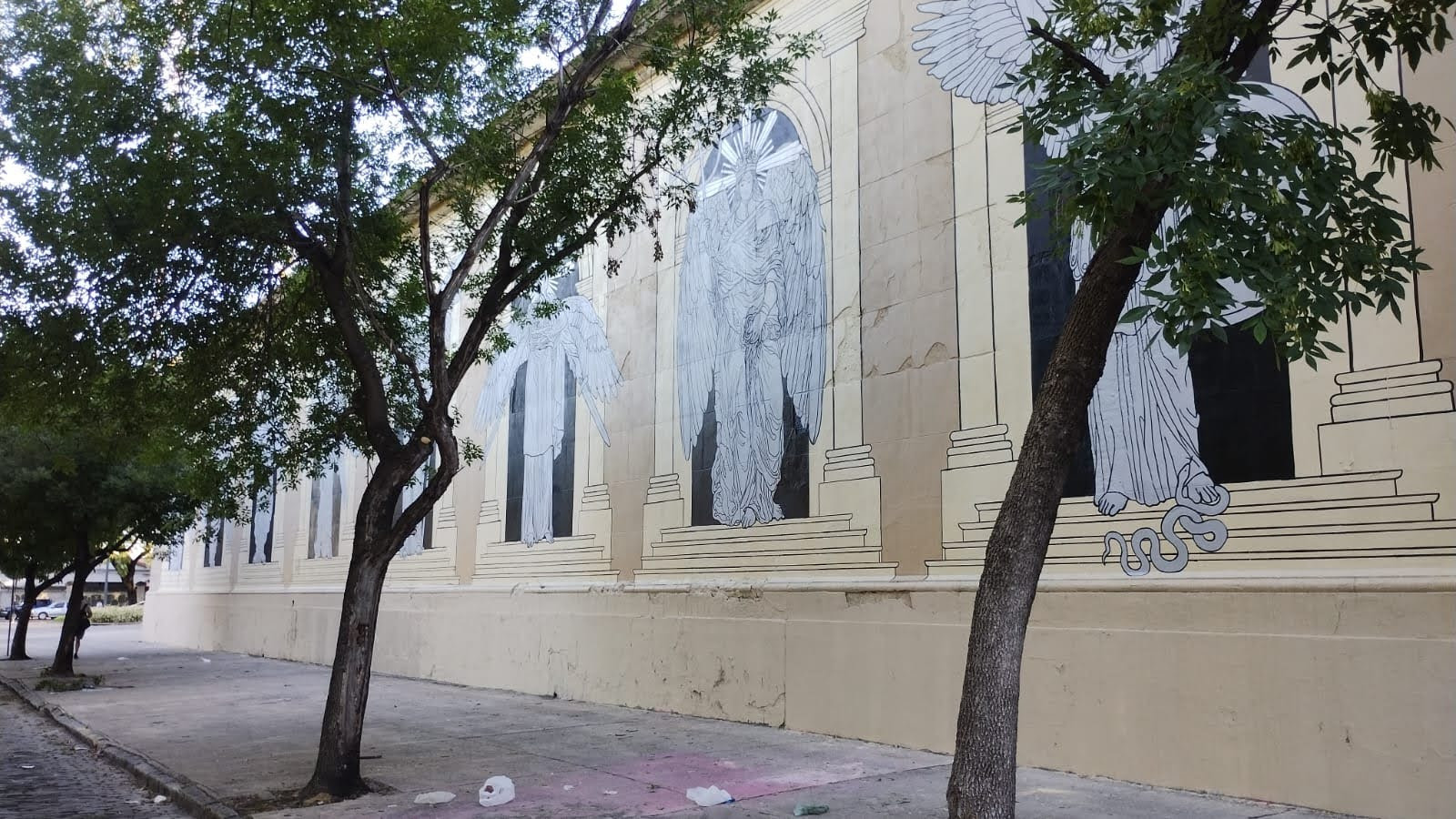 La intervención fue realizada con el apoyo de otros muralistas profesionales que llenaron de color los grises paredones de Chacarita valiéndose de grúas y andamios. En el tramo que parte de la Avenida Jorge Newberry, Tesoreiro, quien es ilustrador y diseñador gráfico, recrea su puerta a los cielos en monocromo con una jerarquía de figuras celestiales. “Hay como un orden bíblico de ángeles, arcángeles, serafines, querubines… distintos niveles”, en una interpretación inspirada por el Art Nouveau, estética “donde hay mucha representación de la figura y de los cuerpos, con conceptos etéreos” para abordar “el más allá” y una trama visual que parte de “de la línea” e invita a acercarse y recorrer el muro. “Que una obra mía esté acá en gran tamaño es muy importante y un orgullo, porque soy del barrio y el cementerio es icónico, además de que es una forma de brindar alegría a la gente”, resalta el artista.