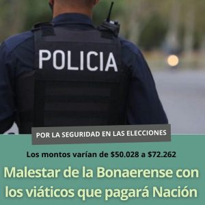 A pocas horas del inicio de la veda electoral, un fuerte malestar se ha desatado entre los efectivos de la Policía de la Provincia de Buenos Aires. El motivo es la baja cifra de los viáticos que el Gobierno Nacional ha dispuesto para su participación en el operativo de seguridad de las próximas elecciones legislativas. Los agentes, que deberán custodiar los perímetros externos de los centros de votación durante una extensa jornada, consideran los montos como “muy bajos” e irrisorios en comparación con la dedicación de horas y los riesgos inherentes a su labor.